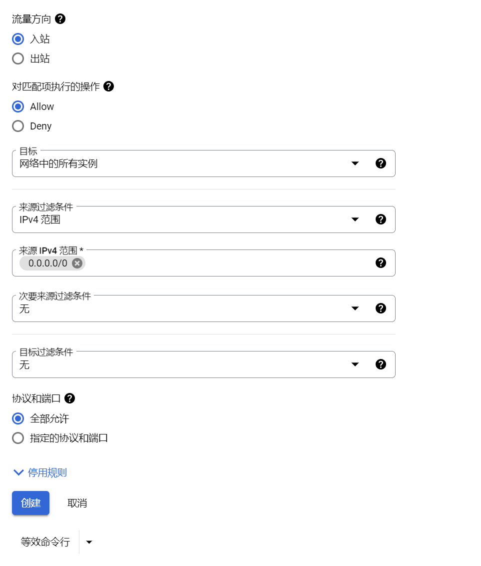 点击 创建防火墙规则 新建一个 VPC 防火墙规则。填写一个防火墙名称,例如:all