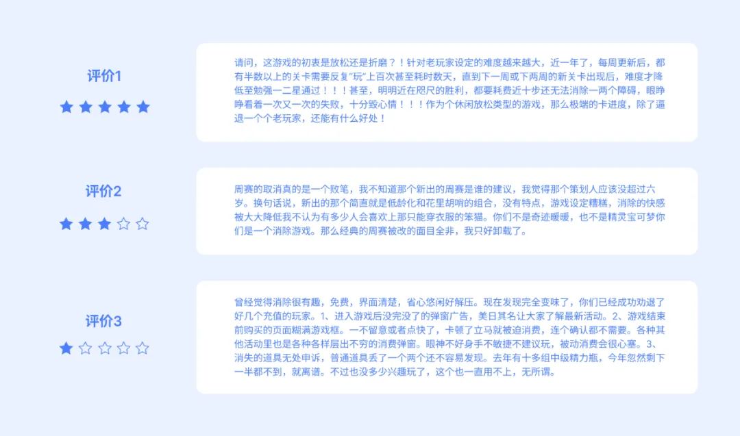 设计师要时刻“和用户在一起”,而用户反馈则是走入用户内心的重要入口。一般来说,收集到用户反馈以后,我们往往只会看评分低的评论,但很多时候,分数并不能完全代表用户的真实心意:有老玩家一朝伤心愤而打低分的,也有打高分实则吐槽和嘲讽的。这时候,如果从用户情感维度进行归类,能更高效地获取有效的反馈。