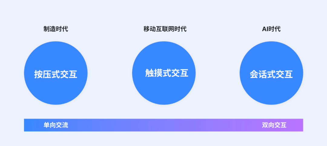 会话式交互将成为苹果触屏式交互后更加符合用户认知和体验的交互形式,走向更加智能的双向交互形式。用户可以通过简单的语音指令或文字输入完成复杂的操作,减少与机器之间的交互时间和学习成本。通过模拟了人与人之间的对话方式,更加自然直观,同时用户也不再需要关注复杂的 UI 和操作方式,只需要按照自然语言的方式与 AI 进行交流就可以完成自己的任务。