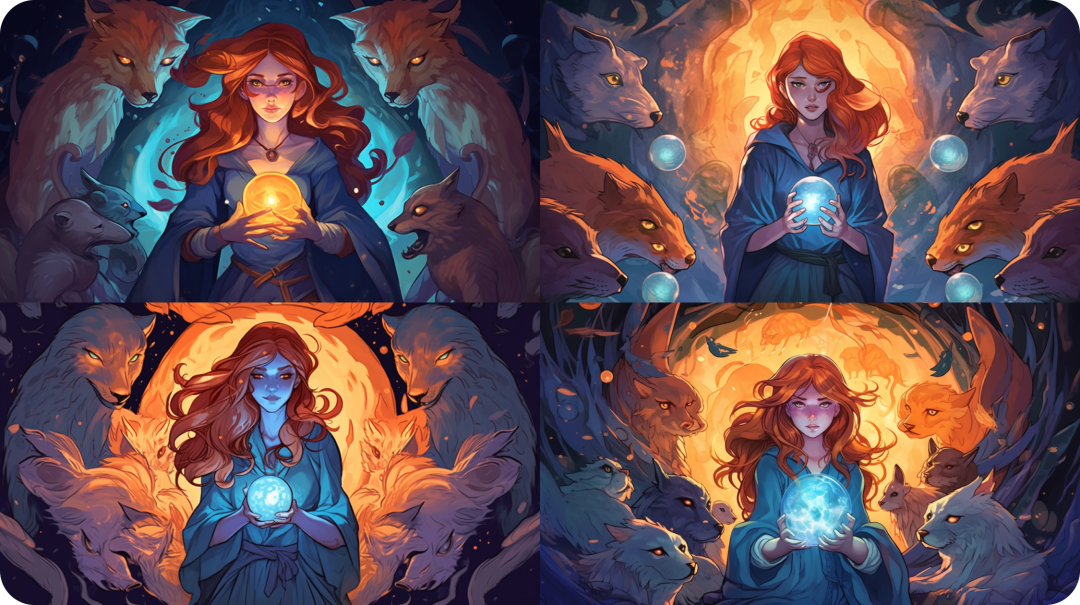 A beautiful seer is holding a glowing magic ball in the center of the picture, with orange-red hair fluttering around her, surrounded by a group of transparent blue magic wolf heads