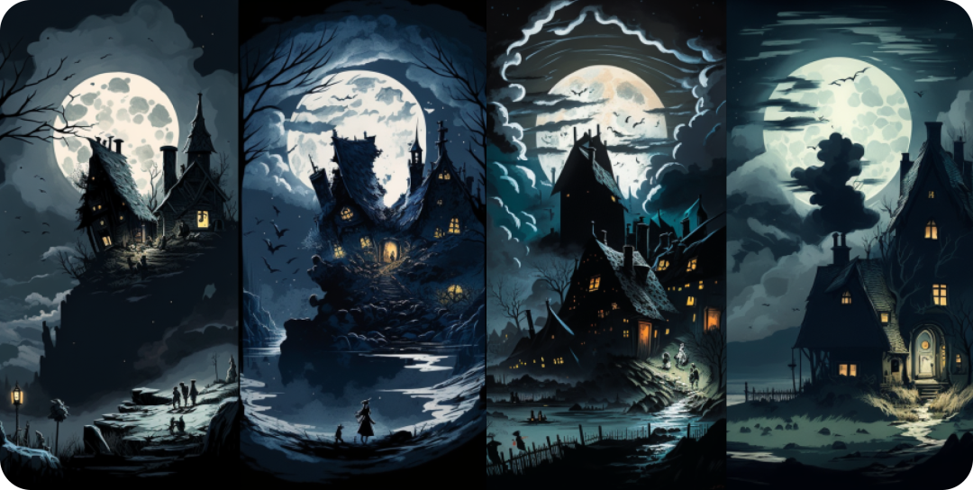 因为古堡和大月亮构图已较为常见,所以我们直接用 Midjourney 进行基础的背景绘制,关键词如下: