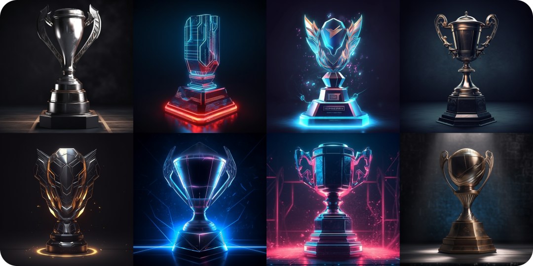 下图是使用 Midjourney 生成的各种奖杯概念图。