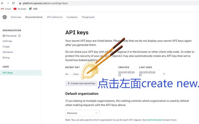 进入图中网站获取你的 chatgpt api key 按图中操作获取新的 api key 并复制