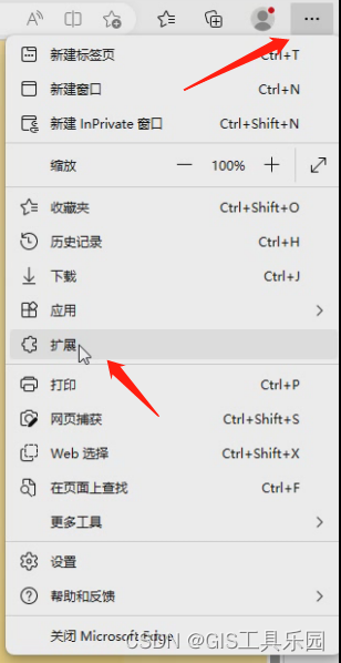 在浏览器右上角点击“…”按钮,在点击“扩展按钮”,如下图所示。