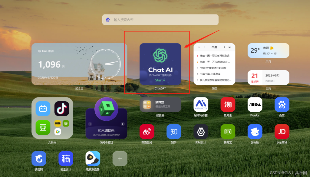 在启用扩展后,在浏览器中新打开一个界面,即进入 WeTab 新标签页,在此界面,我们可以看到 Chat AI,如下图所示。