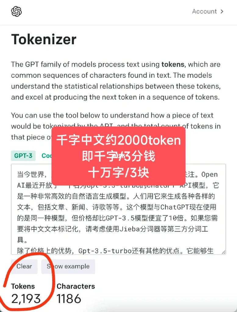 **1000 个汉字大概对应 2193 个 TOKEN,**