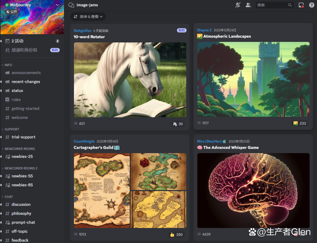 Midjouney 搭载在 discord 平台,你只需要向聊天窗口输入文字就可以生成图像。Midjouney 生成的图片效果非常惊艳,普通人几乎已经很难分辨出它产生的作品,竟然是 AI 绘画生成的。