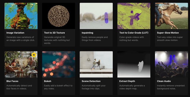 Runwayml 提供了 多种 AI 模型,可用于图像、音频和文本等领域,用户可以通过上传自己的素材与 Runwayml 的模型进行交互,目前用户可以使用 Runwayml 实现的功能包括但不限于: