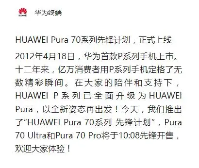 金融界 4 月 18 日消息 刚刚,华为终端官宣推出“HUAWEI Pura 70 系列 先锋计划”,Pura 70 Ultra 和 Pura 70 Pro 将于 10:08 先锋开售。Pura 70 Ultra 售价 9999 起,Pura 70 Pro 售价 6499 起。4 月 22 日,华为 Pura70 Pro+、华为 Pura 70 开售,Pura70 Pro+7999 起售,Pura 70 售价 5499 起。据了解,2012 年 4 月 18 日,华为首款 P 系列手机上市,近期 HUAWEI P 系列全面升级为 HUAWEI Pura。