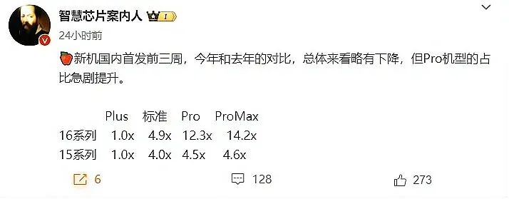 根据博主 @智慧芯片案内人的数据,今年新款 iPhone 在中国市场前三周的销量略有下降。