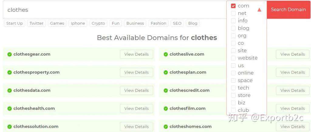 我以 Domainwheel 来举例,比如你想做一个卖衣服的网站,那么可以输入关键词‘clothes’,可以选择.com 网站后缀,点击‘Search Domain’便可以找到很多还没有注册的域名,有合适的可以通过域名注册商 Namesilo 进行注册(接下来会讲到如何操作)