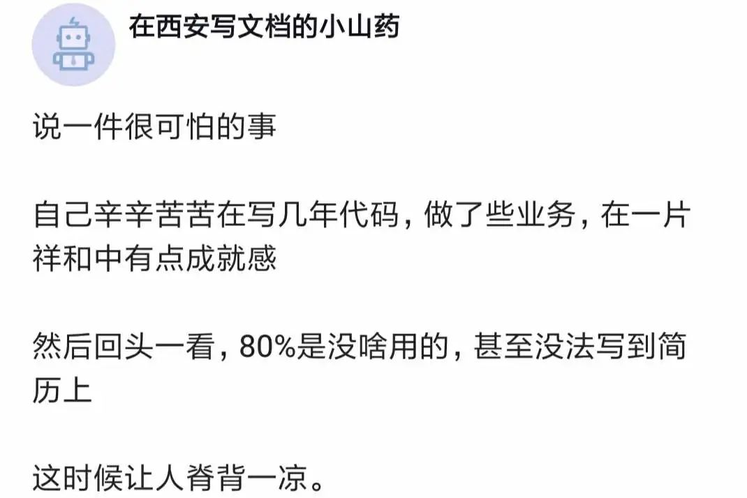 辛辛苦苦写了几年代码,做了些业务,在一片祥和中有了点成就感。然而回头一看,80% 是没啥用的,甚至没法写到简历上,让人脊背一凉!