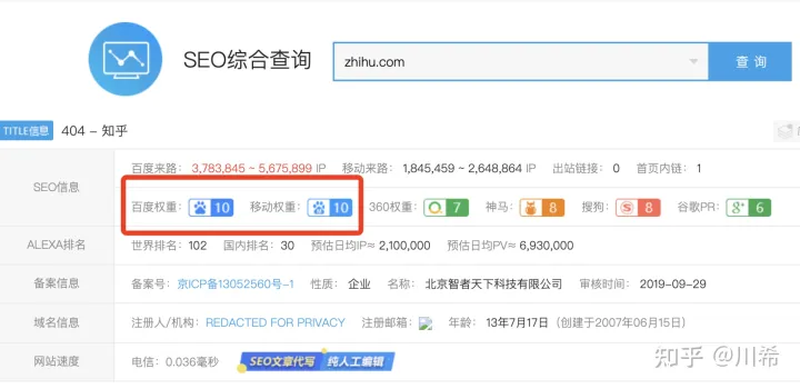 权重 10 的网站,权重分为 1 到 10.10 代表最高。一定不能错过,且知乎与百度存在合作关系,一般你的文章只要在知乎发布,被收录后排名可以说居高不下,对于做排名十分有优势,且搜索首页出现的网站中,知乎出现的次数最多。但知乎平台几乎不能留下明显的联系方式,也不能直接打广告,适合做内容输出。知乎的收录时间 1 天左右就能上百度,不管做长尾关键词还是核心词,排名都在首页。重点推荐!