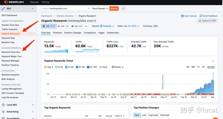 除了 Semrush 网站整体信息报告,网站的关键字竞争分析也是在调研关键词常用的功能,在 Semrush 界面版的 Organic Research 和 Keyword Overview 版块。
