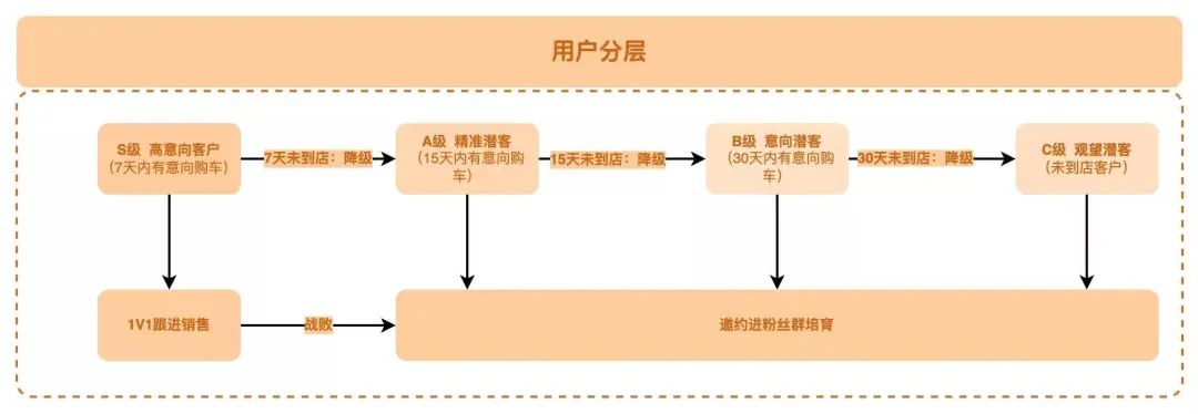 销售人员与用户聊天的过程中,会发现部分用户有答应到店试驾,实际上并没有到店,所以从添加微信起 7 天内,未到店的用户,都要求销售将该用户降级为 B 类用户,同时邀约该用户进入粉丝群进行培育。
