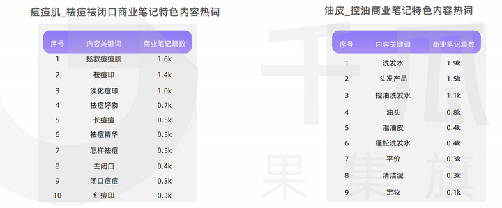 痘痘肌_祛痘祛闭口的内容特色热词,基本都是以用户会遇到实际问题作为切入点,比如拯救痘痘肌、长痘痘、红痘印等,再到满足需求:祛痘印、淡化痘印、去闭口等,针对性十分强。油皮_控油同样以油头、混油皮等现状引入,具体到控油洗发水、蓬松洗发水、清洁泥等解决方案。此外,控油类产品的性价比十分重要,平价成为主打卖点之一。