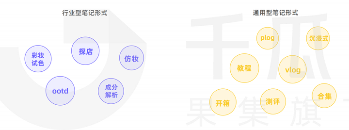通用型笔记形式 (教程、vlog、开箱、测评、合集、沉浸式、plog) 的笔记内容关键词多为行业、时间节点、人群、效果、价格、生活方式等,覆盖小红书用户高频搜索词,能够获得更加广泛的搜索流量。行业型笔记形式 (ootd、探店、彩妆试色、成分解析、仿妆) 则更加集中在时间节点、细分品类、品牌以及具体功效,内容垂直度更高,能够获得更加精准的搜索流量。