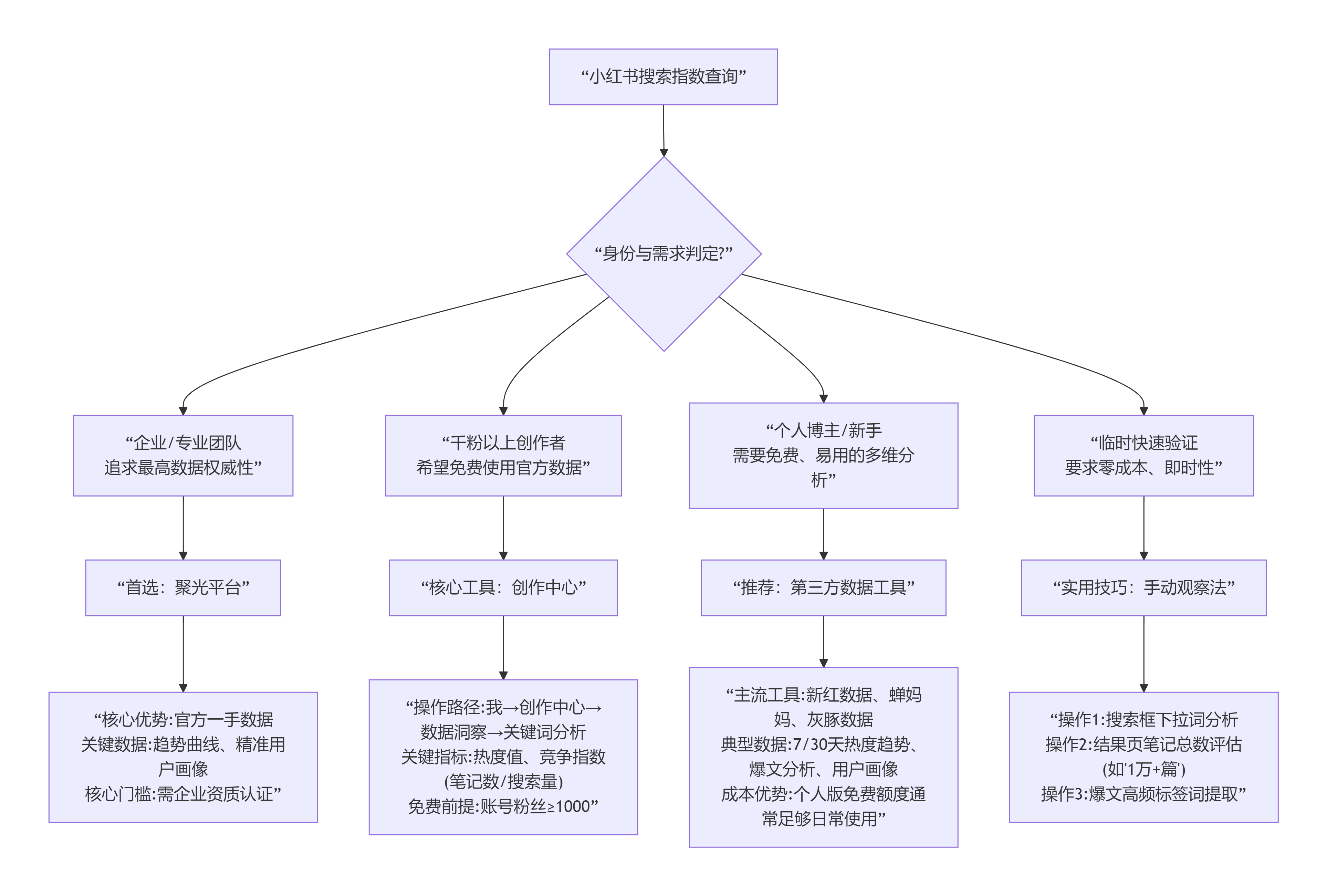 结论 :查询小红书搜索指数存在三种核心路径,最佳选择取决于用户身份(企业 / 个人)、预算与数据深度需求。 官方工具数据最准但门槛高,第三方工具平衡效率与成本,手动观察适合快速验证。