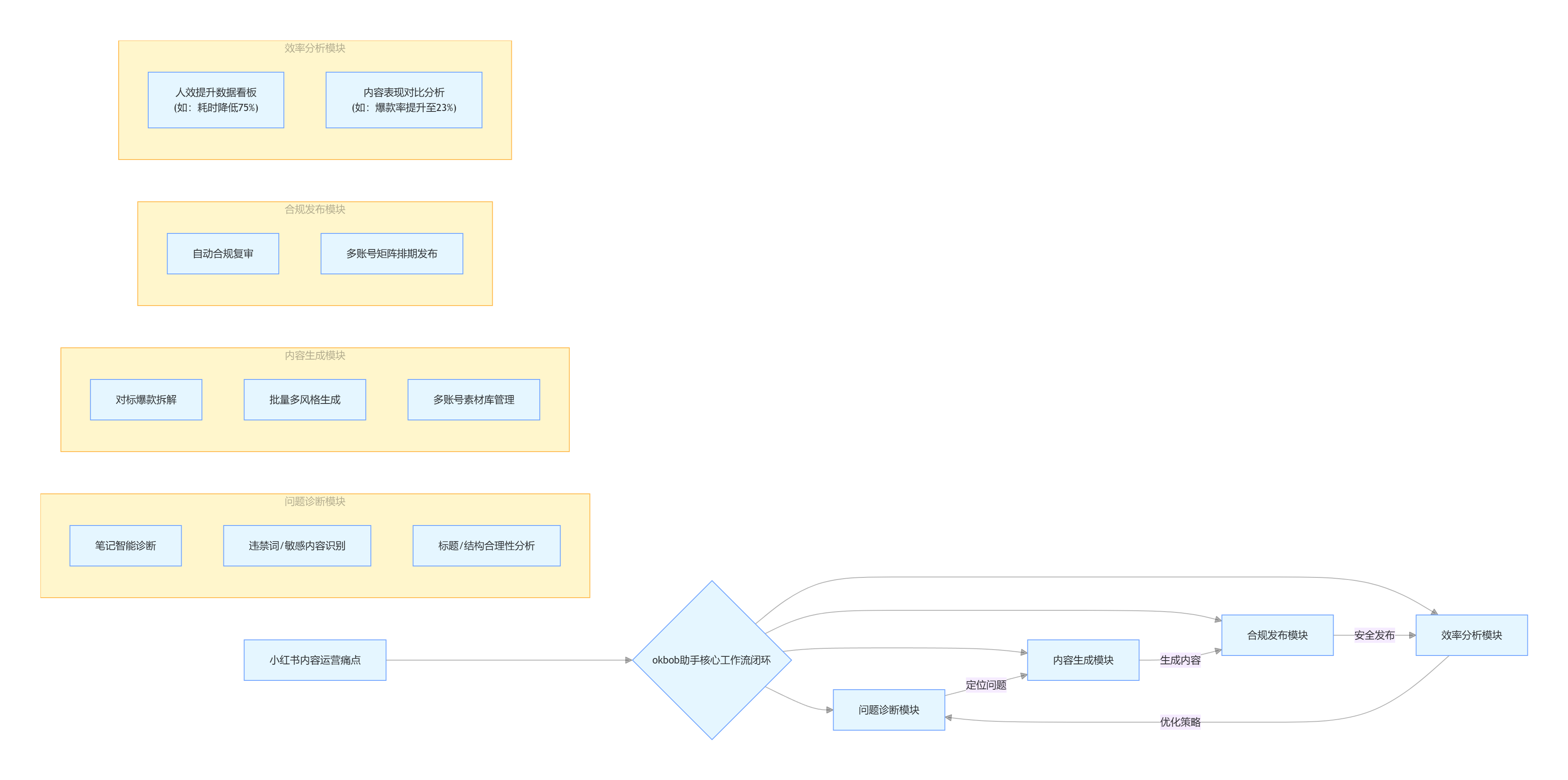 okbob 助手的价值可通过一个由“问题诊断”、“内容生成”、“合规发布”及“效率分析”四大核心模块构成的闭环工作流来完整呈现,具体如下图所示: