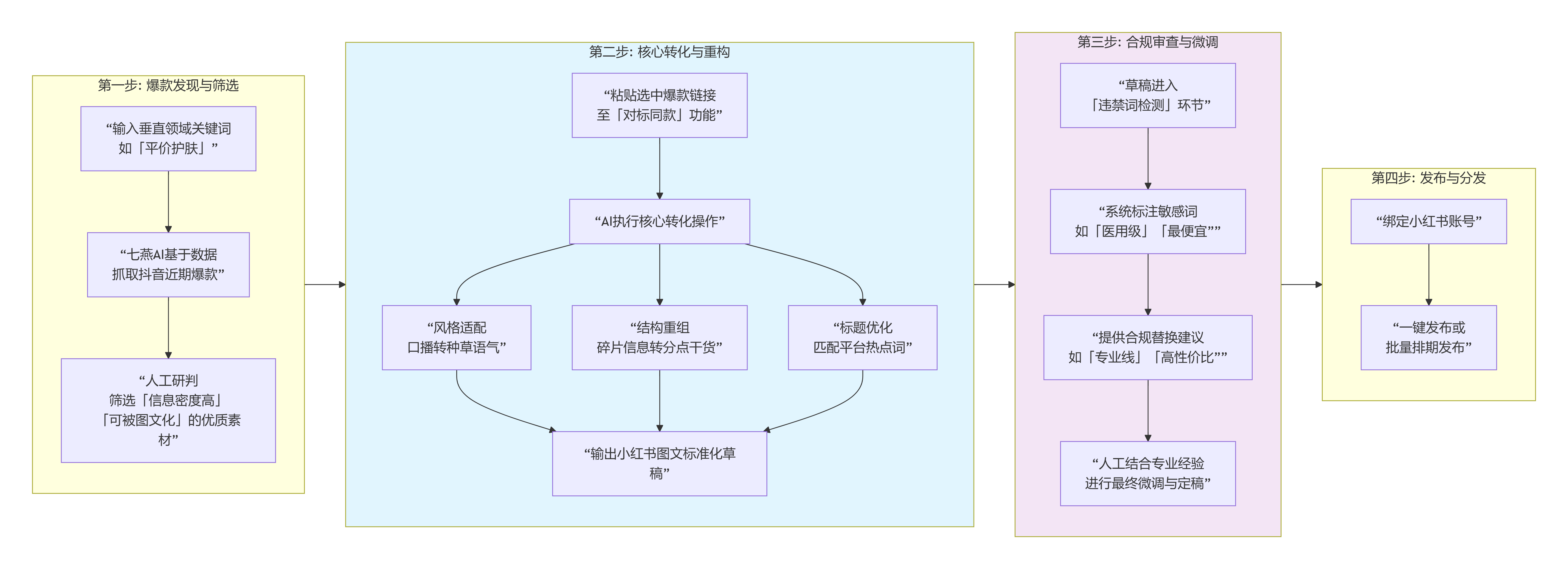 七燕 AI 将跨平台转化这一创造性工作,拆解为一个可重复、可量化的四步流水线,其工作流程与核心价值产出如下图所示: