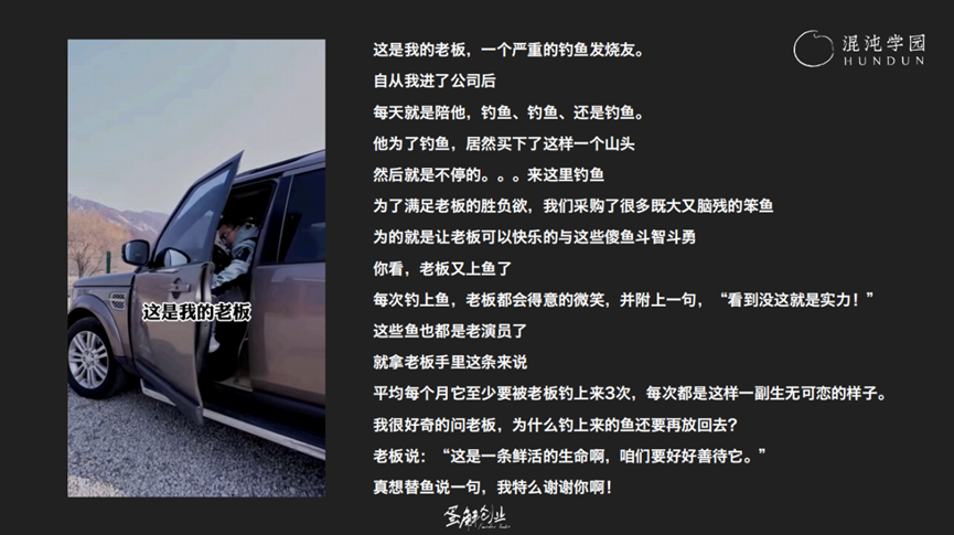 对此,我提供了两个解决方案。第一,如果老板没有镜头感,就别让老板拍了。把企业宣传片的素材换一种逻辑呈现出来。比如下图中我设计的文案。