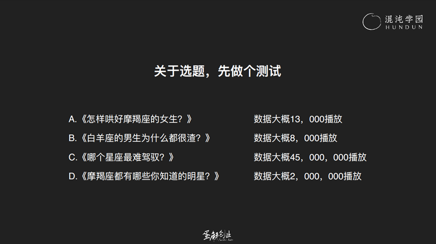答案是 C,为什么?A 项,怎么哄好摩羯座女生,只有两种人会看这类选题。第一种,摩羯座女生,第二种,女朋友是摩羯座的男生。B 项,白羊座男生为什么都很渣? 女孩看到“渣”字可能会比较感兴趣,但这个选题的受众和 A 一样,也只有两种人。C 项,如果不看到最后一秒,就不知道答案。因此,十二星座的男生女生都会想看,这就是好选题。当你还不具备每次都能挑中好选题的能力,就要找到对标账号,让他们帮你验证选题的好坏。再用自己的方式,把好的选题再讲一遍。