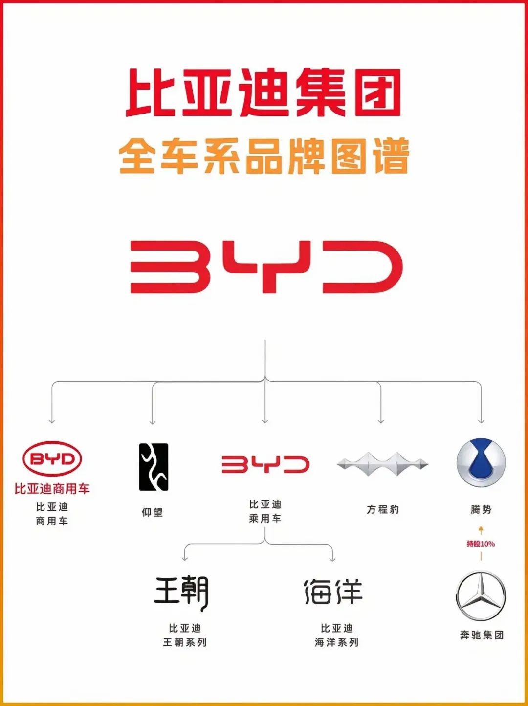 ↑首先现在的国内销量霸主比亚迪,作为民营车企,没有合资,纯靠自己搞。趁着新能源东风,终于壮大了,但也不像一些车企般盲目扩展子品牌。子品牌比亚迪,下面分王朝系和海洋系,主打大众经济型产品;方程豹,打中高端市场,偏个性化产品;腾势,从奔驰那接手过来,打高端市场;仰望,负责开拓百万级以上的豪车市场。比亚迪的品牌架构还是很清晰的。