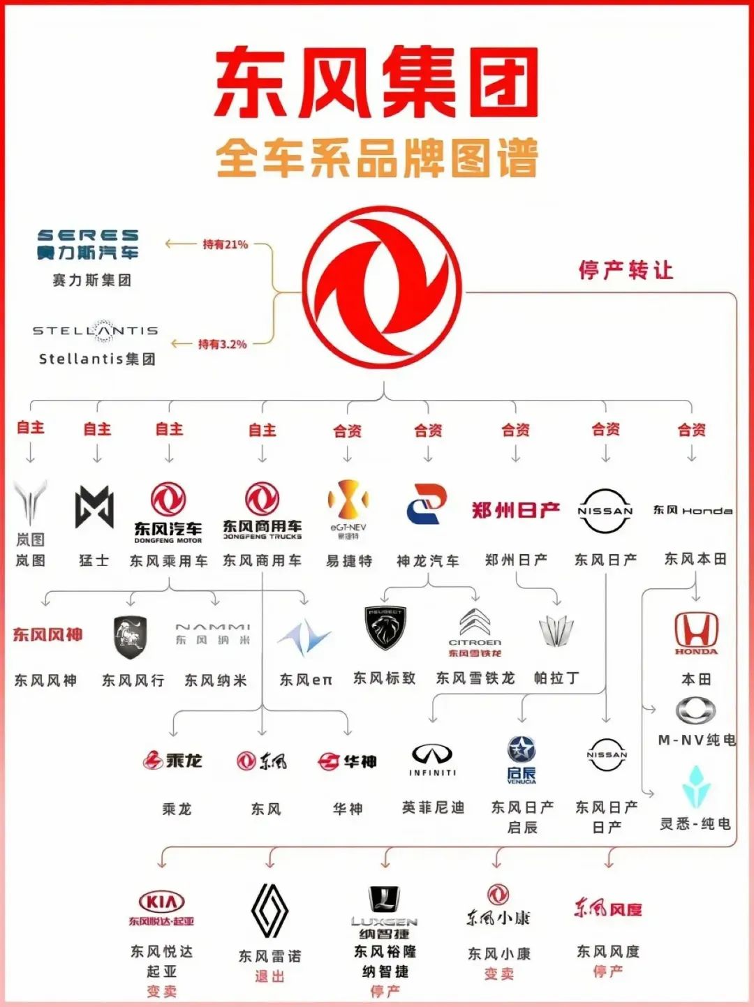 ↑开始复杂起来了,东风集团无论是旗下公司还是旗下子品牌,都堪称国内最复杂的车企之一。自主品牌中,“东风四君子”风神、风行、风光、风度,才发现后两位“君子”已经被踢出去了;去旧迎新,竟又新添了东风纳米和东风奕派。另外岚图步履蹒跚发展着,猛士也被提了上来当子品牌。合资品牌则有神龙汽车,旗下标致和雪铁龙,已经式微。东风日产旗下日产、启辰、英菲尼迪,也危。郑州日产无事可做,也把车型帕拉丁提上来当子品牌。至于东风本田,在新能源压力之下不得不新添了个灵悉品牌,专攻纯电车。
