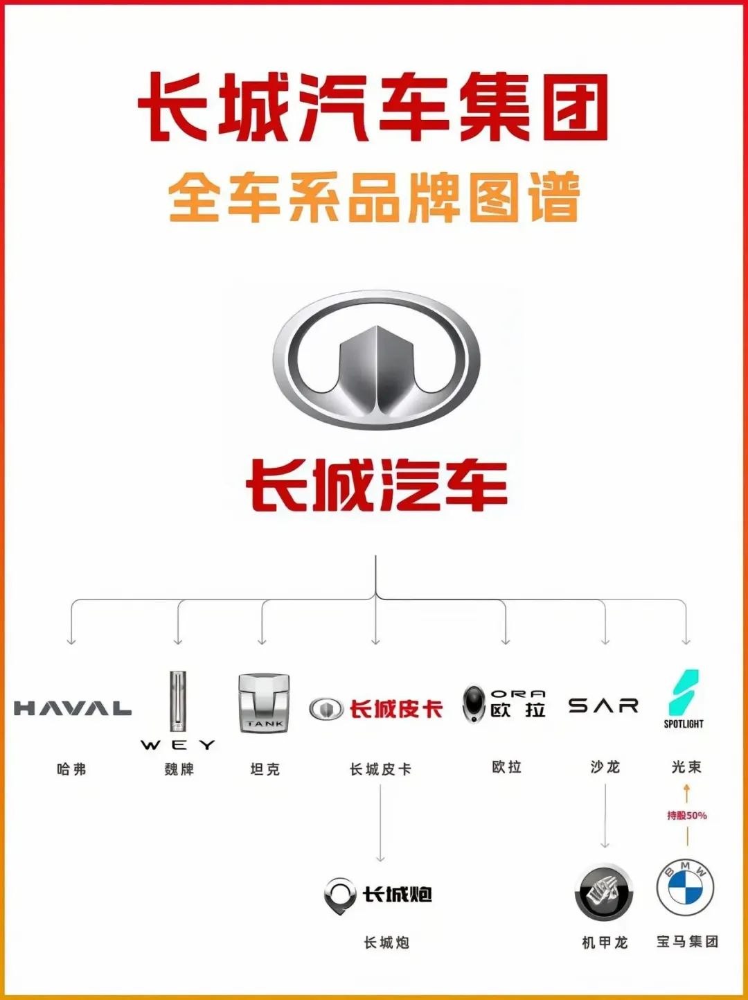 ↑长城跟比亚迪一样,民营车企,靠着皮卡和 SUV 起家。近年来随着高管们脑洞大开,车名和子品牌都有点放飞。子品牌包括发家的长城皮卡,和炮;专攻大众市场的 SUV 哈弗;以魏老板姓氏为品牌名的魏牌。“魏”商标还是比亚迪送的,长城也送了“登陆舰”给比亚迪。坦克主攻硬派越野 SUV,欧拉则是纯电车型,开始涉足轿车领域。至于沙龙和机甲龙,刚展出就说卖光了,也不知到底谁买了,实车都没见一辆。另外还和宝马合资了光束汽车,其实是造纯电 MINI 的。