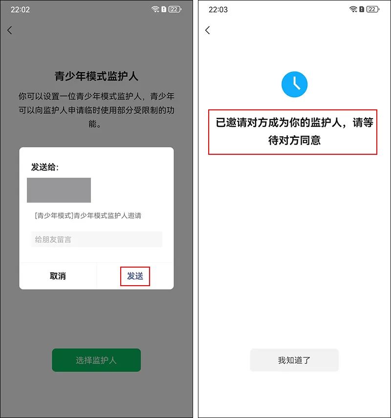 根据提示,设置好独立密码后,会进入【填写监护人信息】环节,要注意了,在填写监护人信息这里,是将你的信息填写进去。填写完毕后,就会进入到【青少年模式】里,在该模式的顶部,可以看到一个醒目的【青少年模式监护人】项,点击进入, 然后在新的界面里,点击底部的【选择监护人】,这时就会进入到你对象的微信好友列表理,在该列表里找到你,然后点击一下你,就会看到一个【发送】或【取消】的提示,果断选择【发送】,发送后,界面会提醒你“已邀请对方成为你的监护人,请等待对方同意”,这个时候拿起你的手机,并打开你的微信。