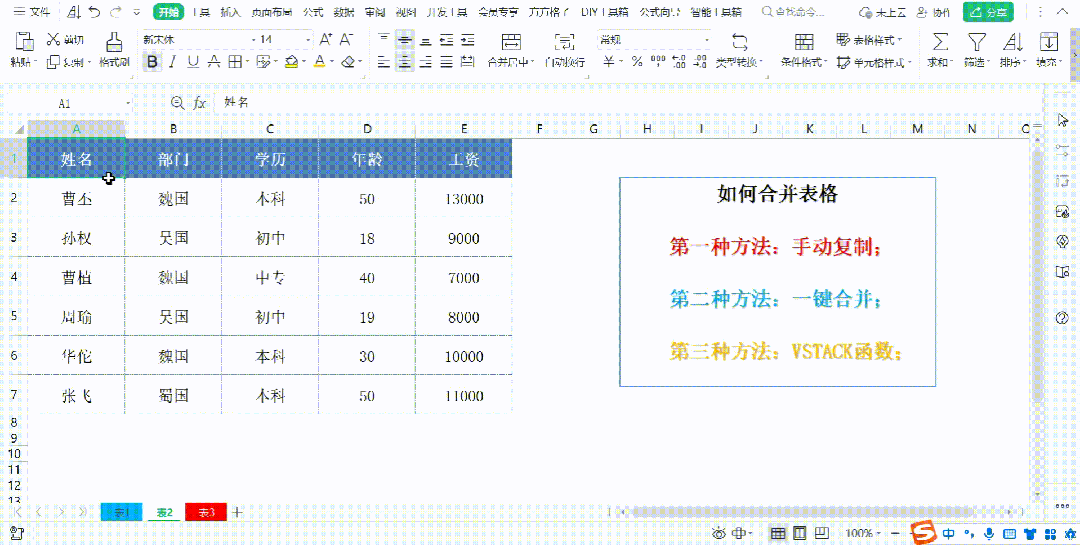 VSTACK 函数公式:=VSTACK(魏国!A1:E7, 蜀国!A2:E7, 吴国!A2:E7)